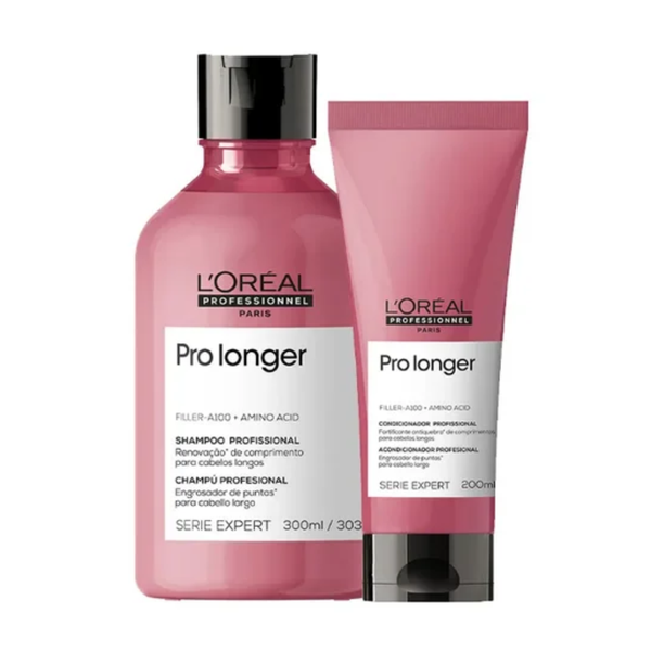 O Kit L'Oréal Professionnel Serie Expert Pro Longer contém 1 Shampoo de 300 ml e 1 Condicionador de 200 ml. O Shampoo limpa completamente, reduz as pontas duplas e proporciona muito mais brilho. O Condicionador preenche a fibra capilar, reforça e devolve a densidade aos fios.