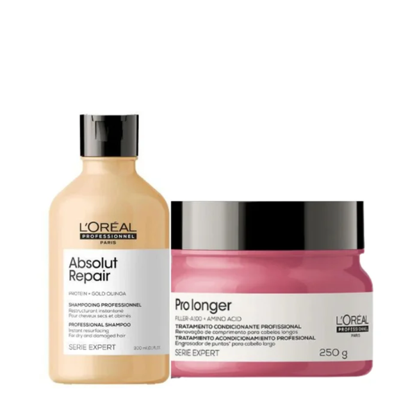 Kit para cabelos danificados, o Kit Absolut Repair + Pro longer repara os fios da raiz as pontas. Com o shampoo absolut repair que repara os fios intesamente, e a máscara pro longer que cuida e protege os fios, dando um cumprimento forte, saudável e lindo!
