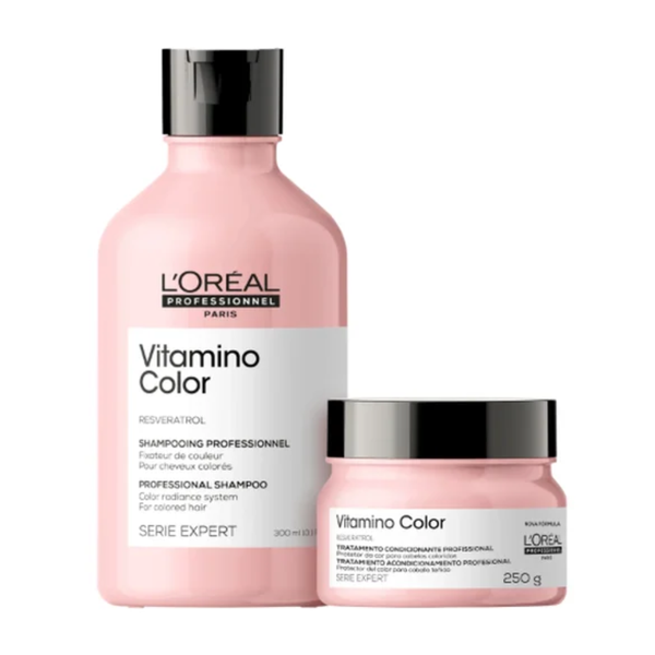 Kit para cabelos coloridos. L’Oréal Professionnel Vitamino Color Duo Care é ideal para manter a cor dos fios vibrante por mais tempo. O Kit Vitamino Color conta com uma fórmula inovadora, enriquecida com Resveratrol, um poderoso antioxidante presente nas uvas que protege os fios dos danos diários, garantindo uma cor radiante e duradoura.
