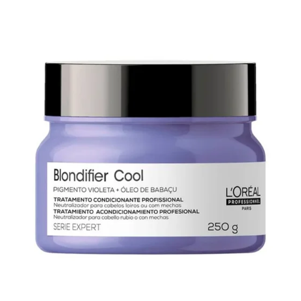 Máscara de tratamento para cabelos loiros e descoloridos. L'Oréal Professionnel Serie Expert Blondifier Cool neutraliza o tom dos fios enquanto nutri intensamente. A Máscara proporciona nutrição profunda e neutralização dos tons amarelos indesejados e brilho intenso. Assim, garante um loiro com tom frio incrível, com muita maciez e luminosidade. A linha Blondifier, de L’Oréal Professionnel, garante maior nutrição e neutralização com produtos formulados especialmente para a ação matizadora. Além do cuidado e revitalização da estrutura interna da fibra capilar, também oferece brilho intenso com os produtos Gloss e remoção dos tons oxidados com os produtos Cool, que tem pigmentos roxos em suas composições. Sua utilização é ideal tanto para lavatório, para correção de cor, quanto indicação de uso diário do profissional para sua cliente.