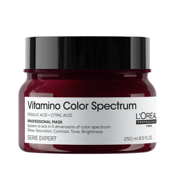 Máscara para cabelos coloridos. L'Oréal Professionnel Vitamino Color Spectrum proporciona hidratação instantânea, força e brilho para uma cor vibrante.