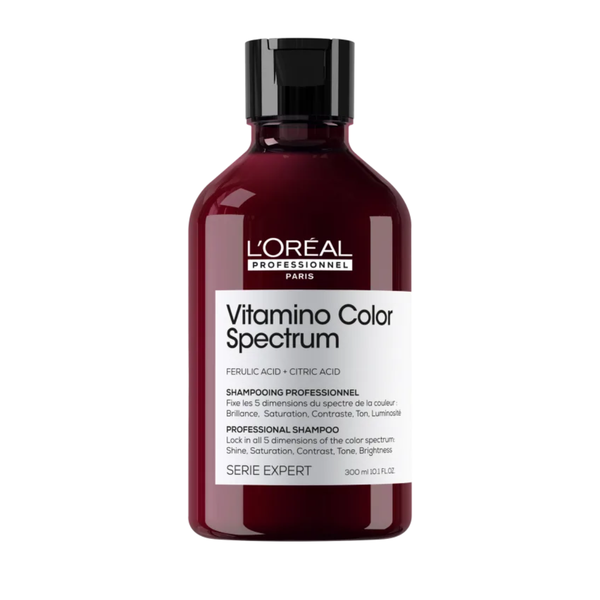 Shampoo para cabelos coloridos. L'Oréal Professionnel Vitamino Color Spectrum ajuda a preservar a vibração da cor por até 100 dias com brilho intenso. A fórmula ultra hidratante cria uma espuma densa que limpa a fibra capilar completamente para um cabelo instantaneamente nutrido e mais forte.